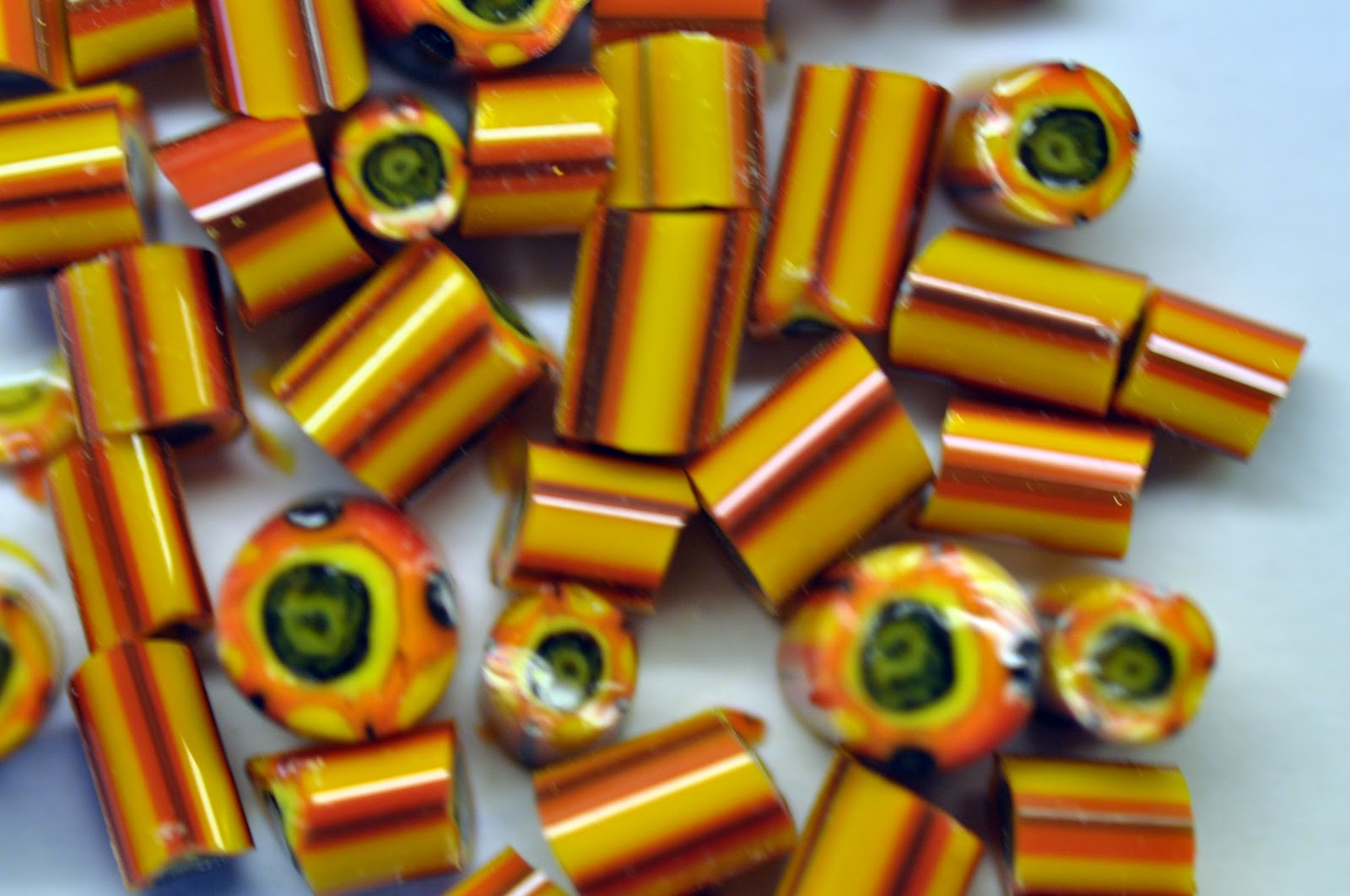 | Elfenbein mit Silberblatt, Rakufrits und eigenen Murrinis |